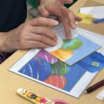 風船の模様は何でもアリ。見本にこだわらず、好きなように貼っていただきました。森住は時々お手伝い。