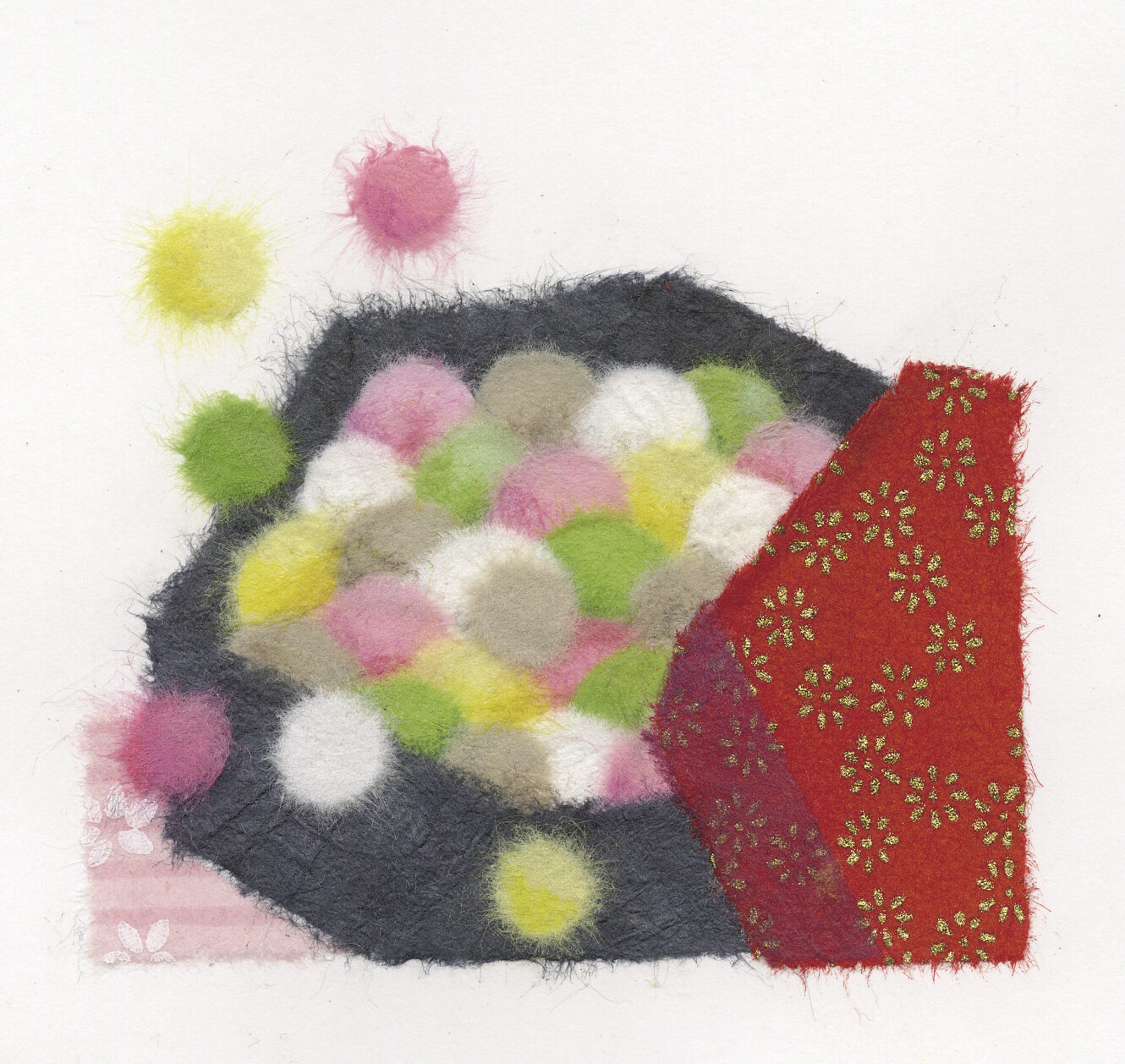 色も形もかわいい五色豆は、煎り大豆を砂糖でくるんだカラフルなお菓子です。カリカリポリポリ楽しくはずむ美味しさを和紙のケバケバに託してみました。箱の花模様は千代紙を用いています。 FacebookXBlueskyHatenaCopy